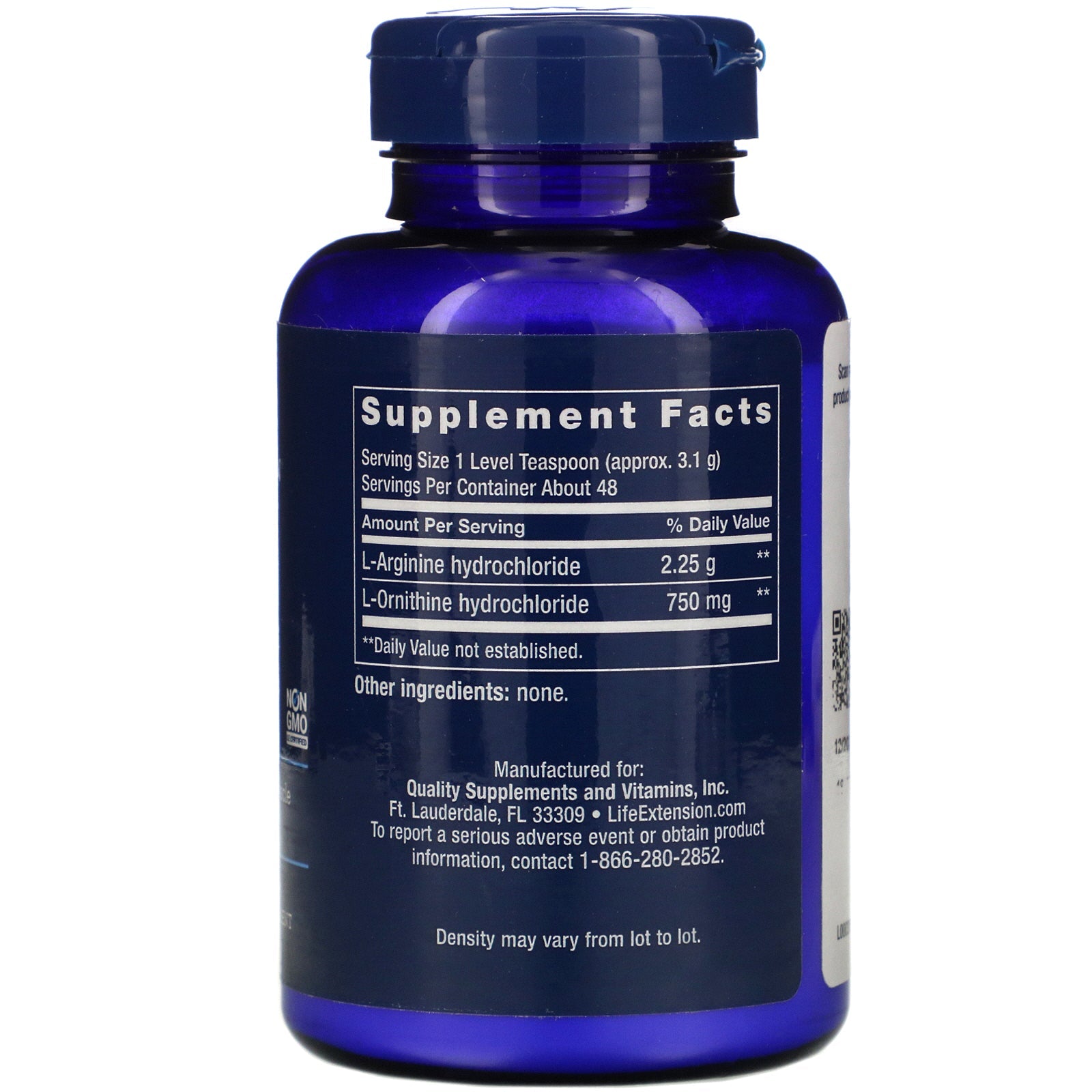 Tamaño de la porción: 1 cucharadita rasa (aprox. 3,1 g) Porciones por envase: aproximadamente 48 Cantidad por porción % Valor diario Clorhidrato de L-arginina 2,25 g ** Clorhidrato de L-ornitina 750 mg ** **Valor diario no establecido. Descargo de responsabilidad