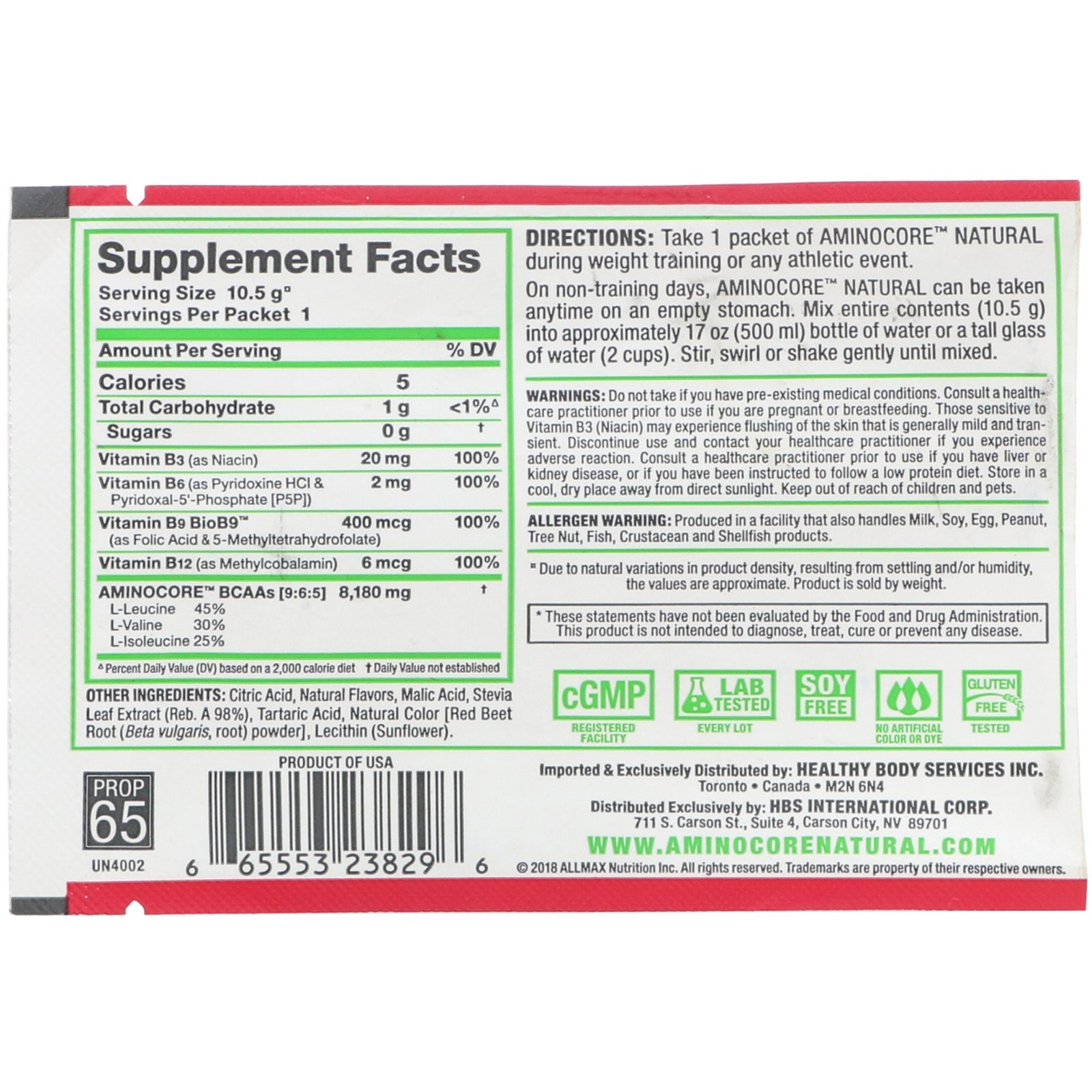 Tome 1 paquete de Aminocore Natural durante el entrenamiento con pesas o cualquier evento deportivo. En los días de no entrenamiento, Aminocore Natural se puede tomar en cualquier momento con el estómago vacío. Mezcle todo el contenido (10,5 g) en una botella de agua de aproximadamente 17 oz (500 ml) o en un vaso grande de agua (2 tazas). Revuelva, revuelva o agite suavemente hasta que se mezcle. Otros ingredientes