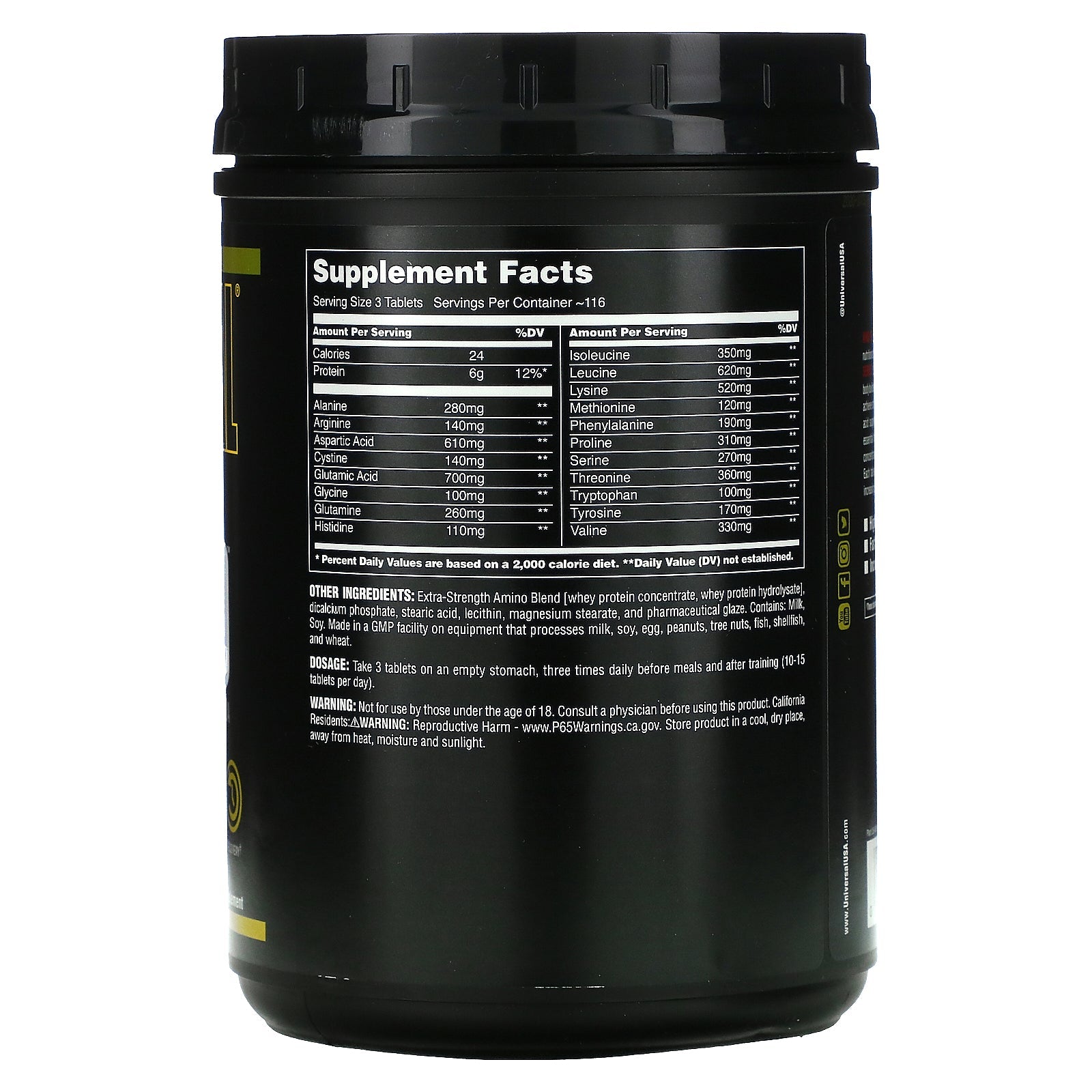 Tamaño de la porción: 3 tabletas Porciones por envase: ~116 Cantidad por porción % DV Calorías 24 Proteína 6 g 12 %* Alanina 280 mg ** Arginina 140 mg ** Ácido aspártico 610 mg ** Cistina 140 mg ** Ácido glutámico 700 mg * * Glicina 100 mg ** Glutamina 260 mg ** Histidina 110 mg ** Isoleucina 350 mg ** Leucina 620 mg ** Lisina 520 mg ** Metionina 120 mg ** Fenilalanina 190 mg ** Prolina 310 mg ** Serina 270 mg ** Treonina 360 mg ** Triptófano 100 mg ** Tirosina 170 mg ** Valina 330 mg ** * Los valores porcentuales diarios se basan en una dieta de 2000 calorías. **Valor Diario (VD) no establecido. Descargo de responsabilidad