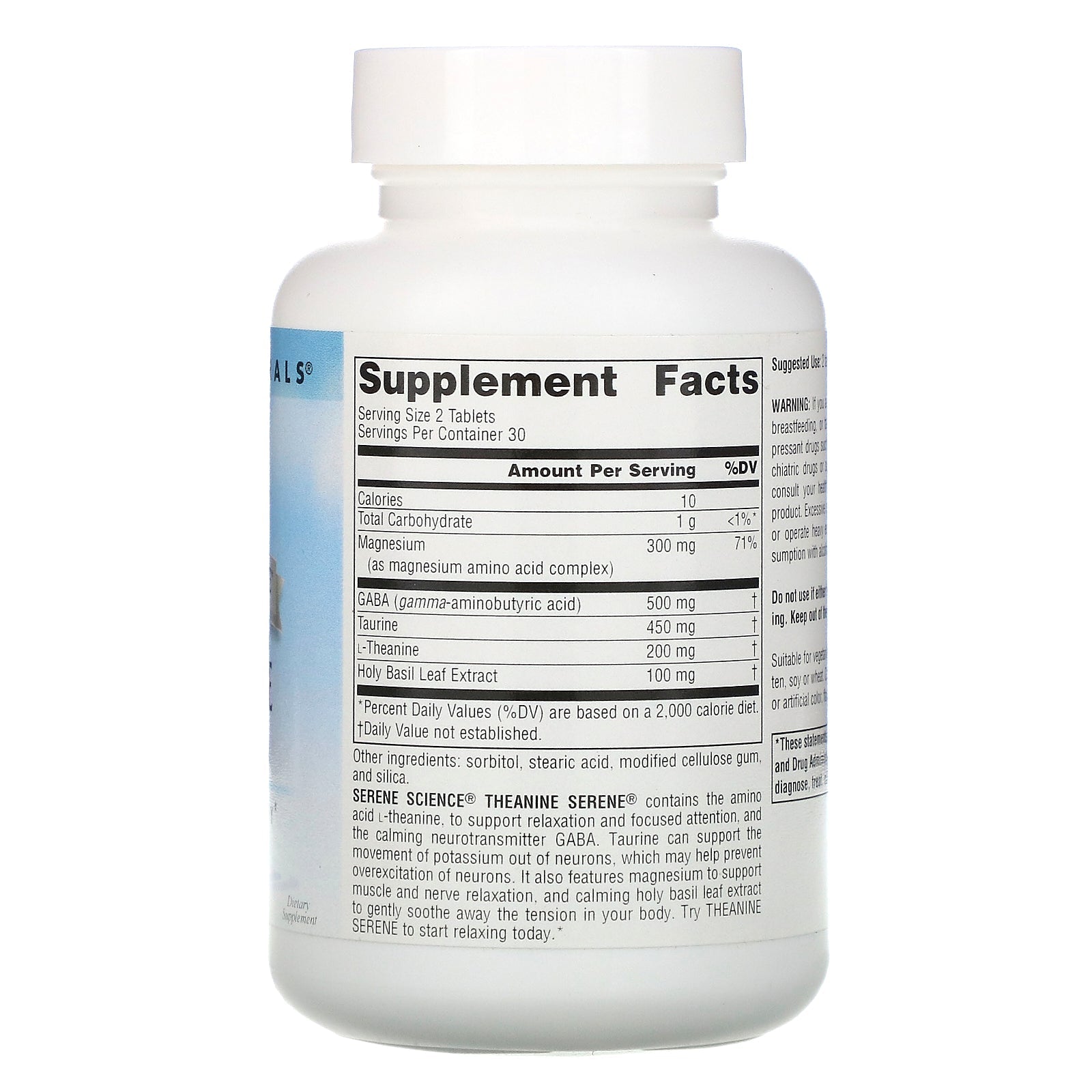 Suplemento dietético calmante para la mente y el cuerpo Adecuado para vegetarianos Serene Science® Theanine Serine™ contiene el aminoácido L-teanina, para favorecer la relajación y la concentración, y el neurotransmisor calmante GABA. La taurina puede favorecer el movimiento del potasio fuera de las neuronas, lo que puede ayudar a prevenir la sobreexcitación de las neuronas. También contiene magnesio para favorecer la relajación de músculos y nervios, y extracto calmante de hoja de albahaca sagrada para aliviar suavemente la tensión del cuerpo. Prueba Teanine Serene para empezar a relajarte hoy. Sugerir. Usar 2 comprimidos al día. Otros ingredientes Sorbitol, ácido esteárico, goma de celulosa modificada y sílice. No contiene levadura, lácteos, huevos, gluten, soja o trigo. No contiene azúcar, almidón, conservantes ni colorantes, sabores ni fragancias artificiales. Hechos suplementarios Tamaño de la porción: 2 tabletas Porciones por envase: 30 Cantidad por porción % DV Calorías 10 Carbohidratos totales 1 g <1...
