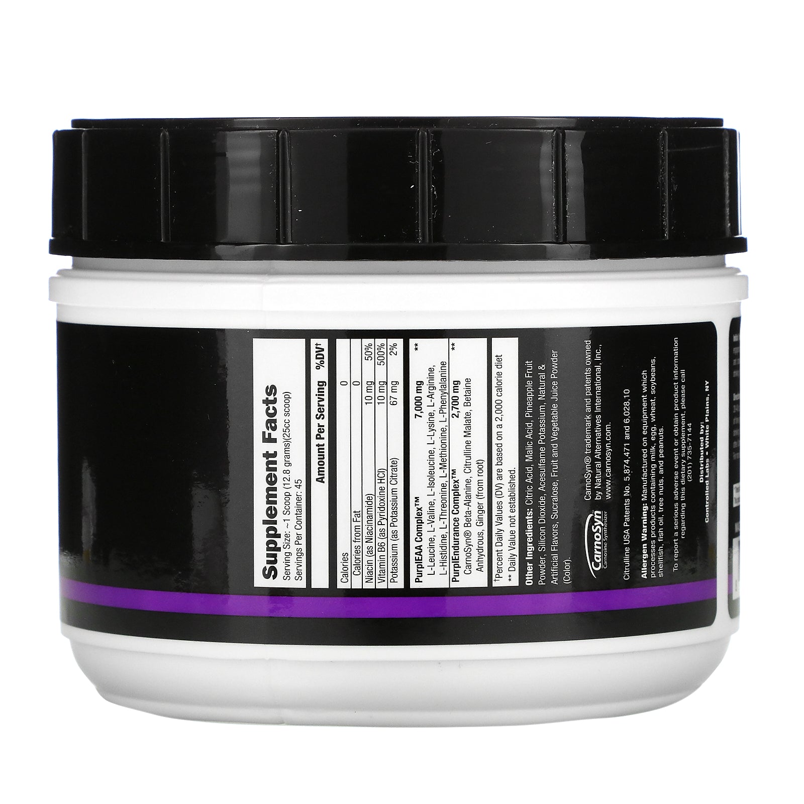 Tamaño de la porción: ~ 1 cucharada (12,8 gramos) (cucharada de 25 cc) Porciones por envase: 45 Cantidad por porción %DV† Calorías 0 Calorías de grasa 0 Niacina (como niacinamida) 10 mg 50 % de vitamina B6 (como piridoxina HCl) 10 mg 500 % potasio (como citrato de potasio) 67 mg 2 % PurplEAA Complex™ L-leucina, L-valina, L-isoleucina, L-lisina, L-arginina, L-histidina, L-treonina, L-metionina, L-fenilalanina 7000 mg ** PurplEndurance Complex™ CarnoSyn® Beta-alanina, malato de citrulina, betaína anhidra, jengibre (de la raíz) 2700 mg ** †El porcentaje de valores diarios (VD) se basa en una dieta de 2000 calorías ** Valor diario no establecido. Descargo de responsabilidad