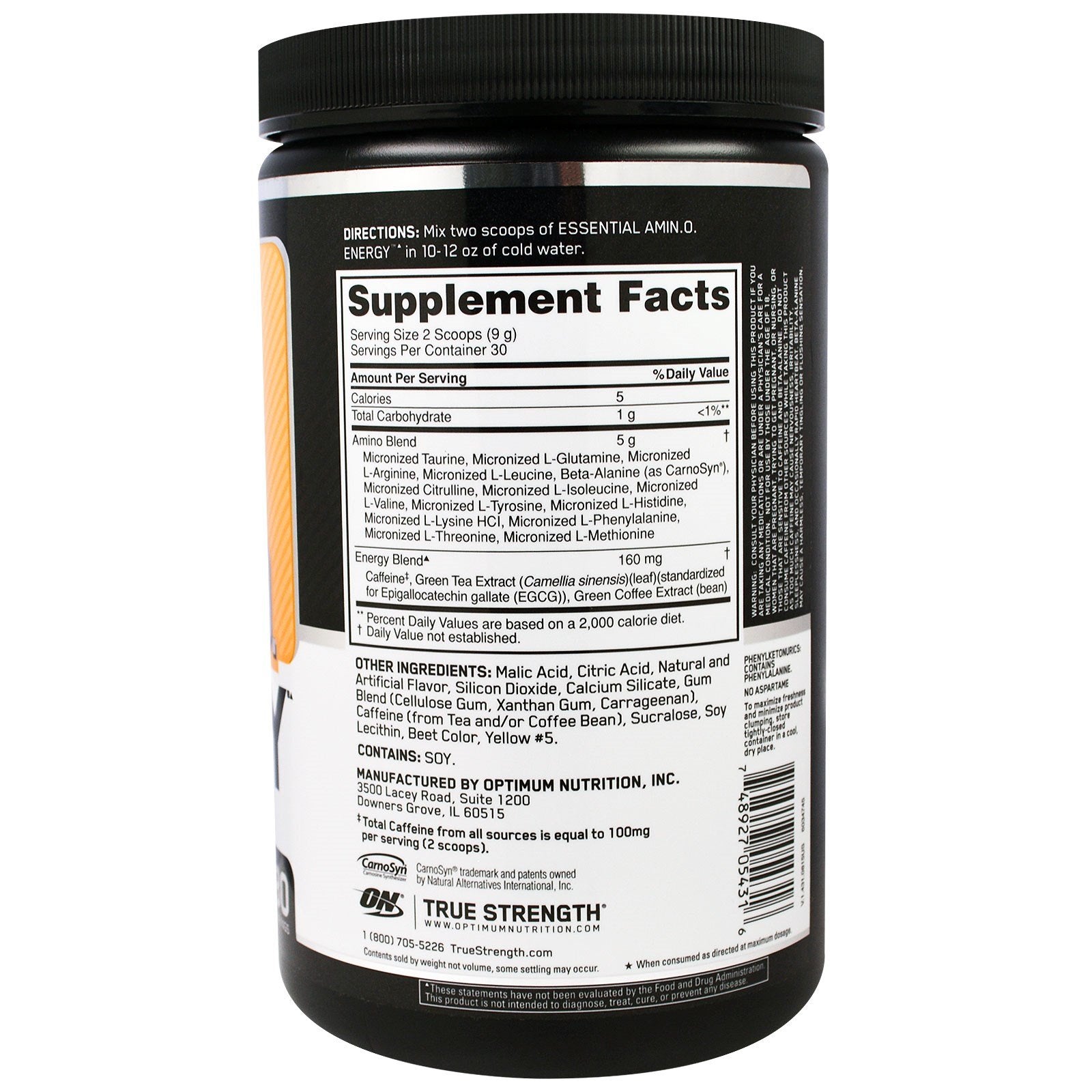 Tamaño de la porción: 2 cucharadas (9 g) Porciones por envase: 30 Cantidad por porción % valor diario Calorías 5 Carbohidratos totales 1 g < 1 %** Mezcla de aminoácidos Taurina micronizada, L-glutamina micronizada, L-arginina micronizada, L-leucina micronizada , Beta-alanina (como CarnoSyn®), L-citrulina micronizada, L-isoleucina micronizada, L-valina micronizada, L-tirosina micronizada, L-histidina micronizada, L-lisina HCl micronizada, L-fenilalanina micronizada, L-treonina micronizada , L-metionina micronizada 5 g † Mezcla energética de cafeína‡, Extracto de té verde (Camellia sinensis) (hoja) (estandarizado para galato de epigalocatequina (EGCG)), Extracto de café verde (grano) 160 mg † *Los valores porcentuales diarios se basan en una Dieta de 2.000 calorías. **Valor diario no establecido. Descargo de responsabilidad