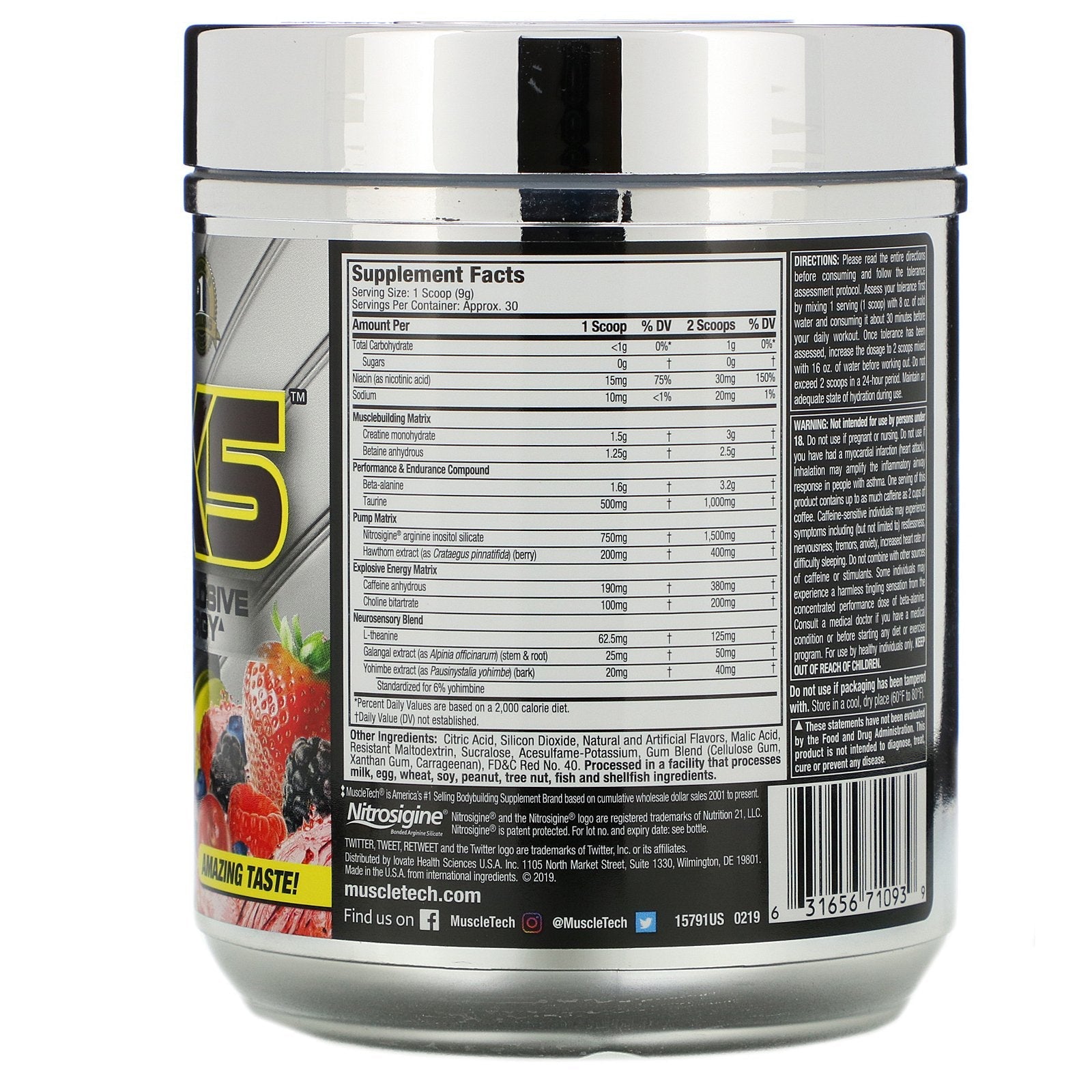Tamaño de la porción: 1 cucharada (9 g) Porciones por envase: Aprox. 30 Cantidad por porción 1 cucharada %Valor diario 2 cucharadas %Valor diario Calorías 15 30 Carbohidratos totales <1 g 0%* 1 g 0%* Azúcares 0 g † 0 g † Niacina (como ácido nicotínico) 15 mg 75 % 30 mg 150 % Sodio 10 mg <1% 20 mg 1% Matriz de desarrollo muscular Monohidrato de creatina 1,5 g † 3 g † Betaína anhidra 1,25 g † 2,5 g † Compuesto de rendimiento y resistencia Beta-alanina (CarnoSyn) 1,6 g † 3 g † Taurina 500 mg † 1000 mg † Matriz de bomba Silicato de arginina inositol (nitrosigina) 750 mg † 1500 mg † Extracto de espino (Crataegus pinatifida) (baya) 200 mg † 400 mg † Matriz energética explosiva Cafeína anhidra 190 mg † 380 mg † Bitartrato de colina 100 mg † 2 00 mg † Mezcla neurosensorial L-teanina 62,5 mg † 125 mg † Extracto de galanga (como Alpinia offcinarum) (tallo y raíz) 25 mg † 50 mg † Extracto de yohimbe (como Pausinystalia yohimbe) (corteza) Estandarizado para 6 % de yohimbina 20 mg † 40 mg † *El porcentaje del valor diario (VD) se basa en una dieta de 2000 calorías. †Valor diario (VD) no establecido. Descargo de responsabilidad