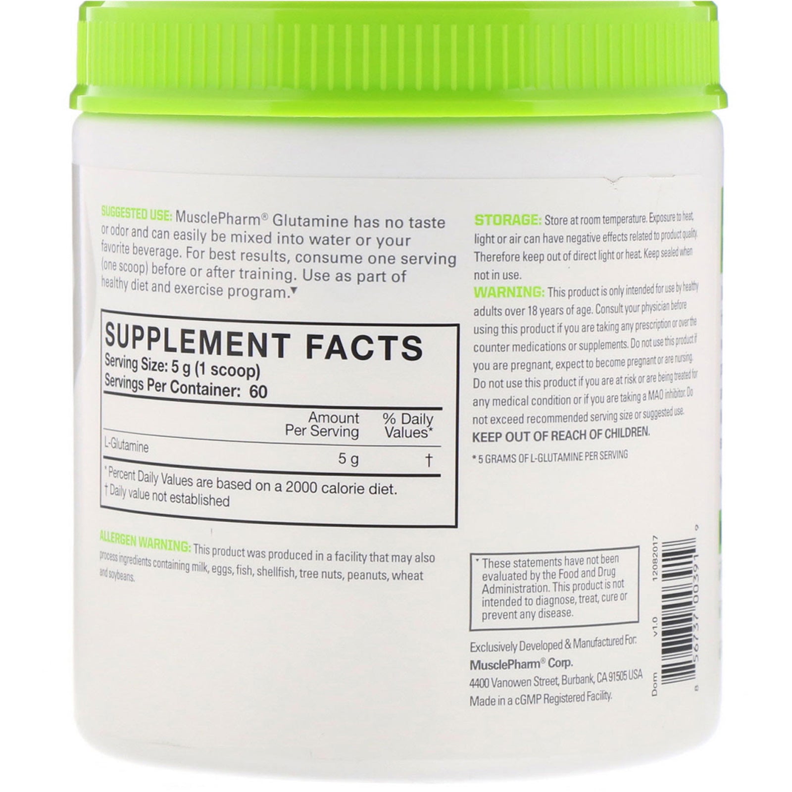 La glutamina MusclePharm no tiene sabor ni olor y se puede mezclar fácilmente con agua o con su bebida favorita. Para obtener mejores resultados, consuma una porción (una cucharada) antes o después del entrenamiento. Úselo como parte de una dieta saludable y un programa de ejercicio. Otros ingredientes