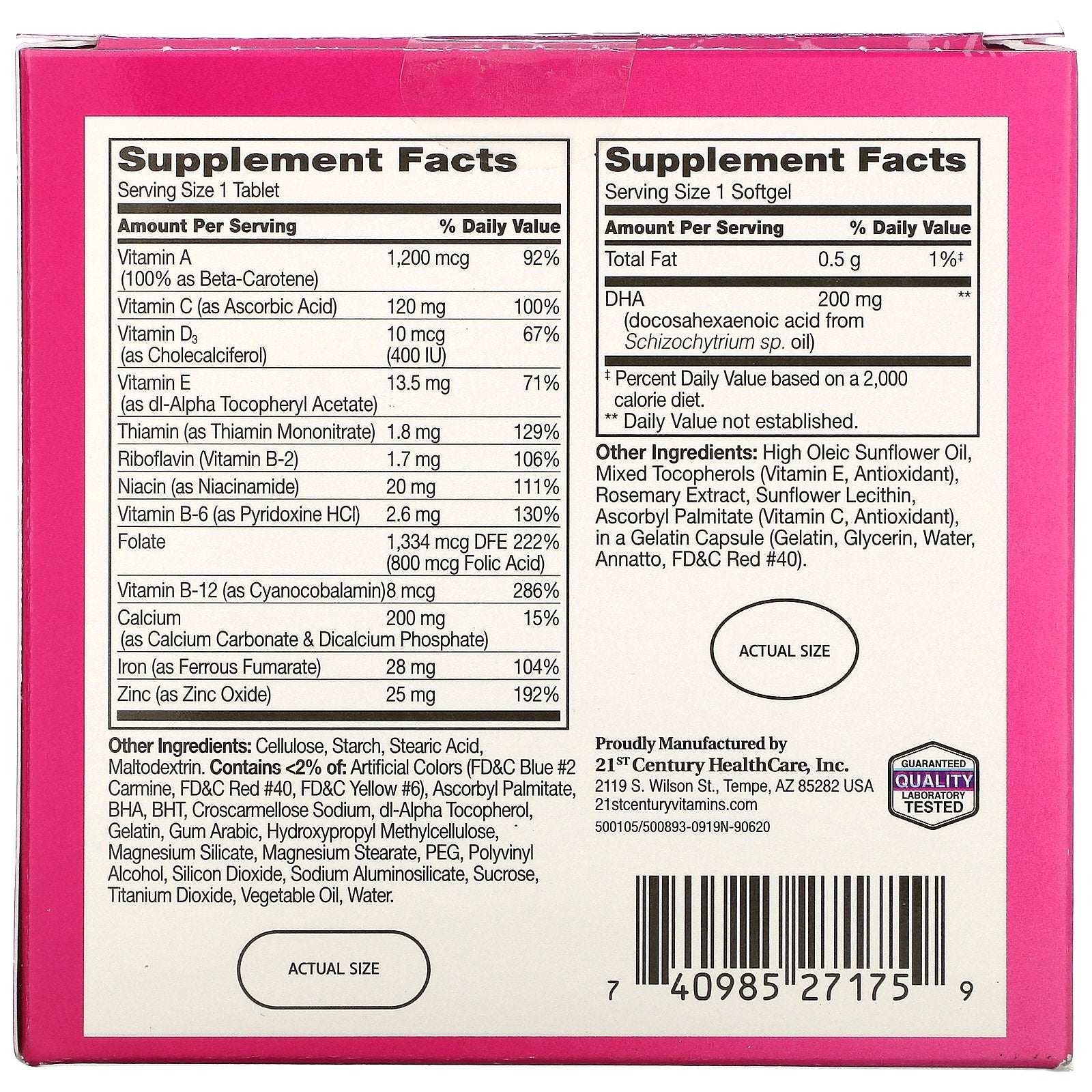 For Use Before, During & After Pregnancy With Folic Acid & Iron Dietary Supplement Laboratory Tested - Guaranteed Quality 2 Step: 60 Tablets 60 Softgels 21st Century ® PreNatal Multivitamin tablets provide vitamin and mineral supplementation throughout pregnancy and during postnatal period and includes 100% of the key nutrients like folic acid and iron. 21st Century ® PreNatal DHA softgels are a non-fish source of Omega-3 fatty acids that help support mother and baby during pregnancy and breast feeding. PreNatal DHA softgels can be taken in combination with the prenatal multivitamin.Sugg. UseAs a dietary supplement for pregnant and nursing women, take one (1) tablet and one (1) softgel daily with a meal or as directed by your healthcare provider. Do not exceed recommended dosage. Individual results may vary.Other Ingredients(Tablet): Cellulose, starch, stearic acid, maltodextrin. Contains <2 of: Artificial colors (fd&c blue #2 carmine, fd&c red #40, fd&c yellow #6), ascorbyl...
