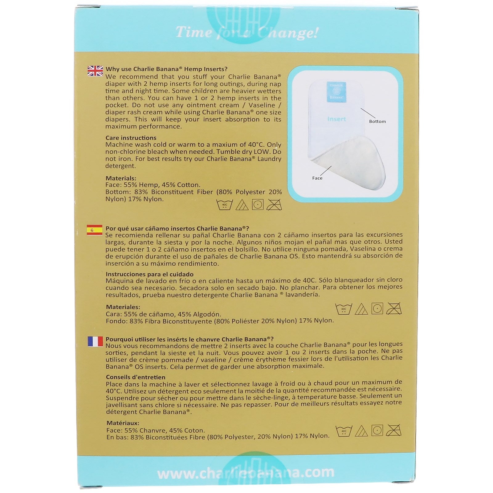Healthy, Eco Friendly, Economical Time for a Change Why use Charlie Banana Hemp Inserts? We recommend that you stuff your Charlie Banana diaper with 2 hemp inserts for long outings, during nap time and night time. Some children are heavier wetters than others. You can have 1 or 2 hemp inserts in the pocket. Do not use any ointment cream / vaseline / diaper rash cream while using Charlie Banana one size diapers. This will keep your insert absorption to its maximum performance.