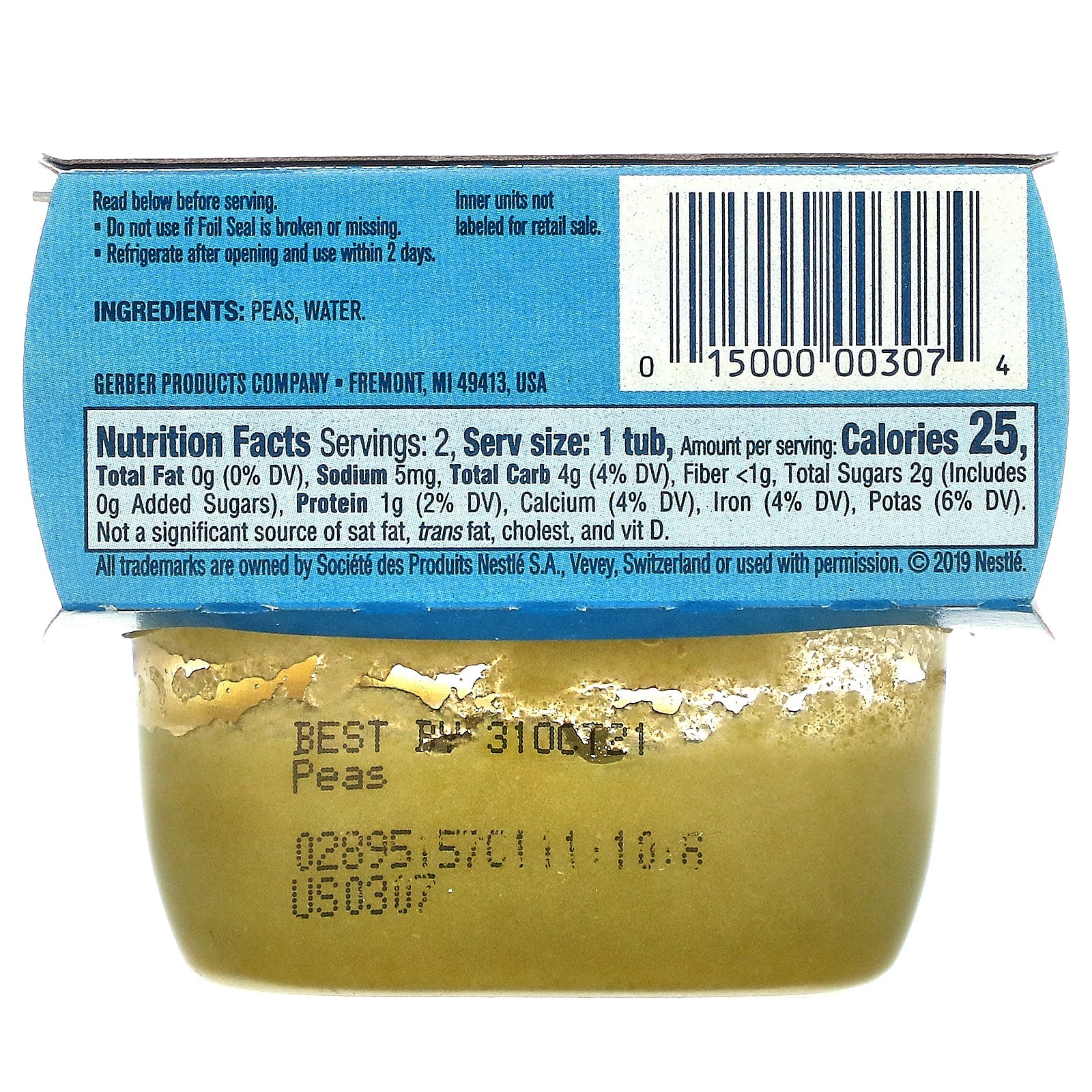 Supported Sitter 1st Foods® Non GMO Project Verified No Artificial Flavors or Colors Packaging Made with No BPA The Goodness Inside: 60 Peas in Each Tub These peas were grown using our Clean Field Farming™ practices.Sugg. UseBaby foods may be served at room temperature or warmed. You can feed your baby directly from each convenient tub. If one tub is too large for your baby, spoon out the desired portion into another dish for feeding and refrigerate the unused portion to enjoy later (within 2 days of opening). If you feed directly from the container, discard any unused portion. To warm: Remove foil seal completely and discard Heat on high for 15 seconds in microwaves up to 1500w Stir. Always test temperature (by tasting) before serving Refrigerate after opening and use within 2 days.Other IngredientsPeas, water.Supplement FactsServing Size: 1 tub Servings Per Container: 2 Amount Per Serving % Daily Value...