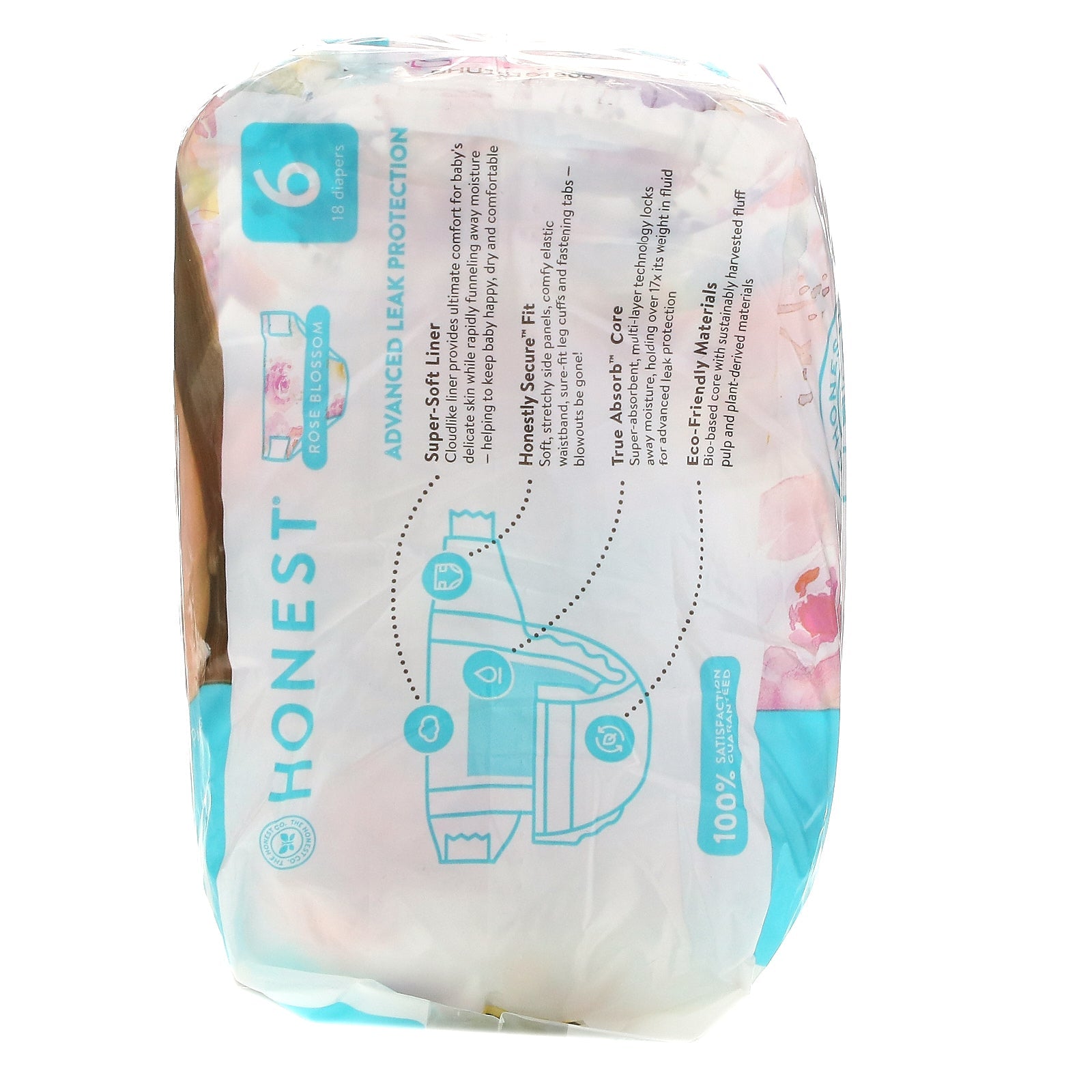 Gentle + Absorbent Super-Soft Liner Hypoallergenic Eco-Friendly Secure Fit True Absorb™ Technology Advanced Leak Protection Holds Over 17x Its Weight in Fluid 100% Satisfaction Guaranteed Not Tested On Animals Made without: Latex Fragrances or Lotions Chlorine Processing Advanced Leak Protection Super-Soft Liner Cloudlike liner provides ultimate comfort for baby's delicate skin while rapidly funneling away moisture - helping to keep baby happy, dry and comfortable. Honestly Secure™ Fit Soft, stretchy side panels, comfy elastic waistband, sure-fit leg cuffs and fastening tabs - blowouts be gone! True Absorb™ Core Super-absorbent, multi-layer technology locks away moisture, holding over 17x its weight in fluid for advanced leak protection. Eco-Friendly Materials Bio-based core with sustainably harvested fluff pulp and plant-derived materials. Our Honest Purpose We're on a mission to empower people to live happy, healthy lives.Sugg. UseOther IngredientsMaterials : Absorbent bio-core [totally chlorine-free (tcf) wood pulp from sustainably managed forests, sodium polyacrylate containing renewable...