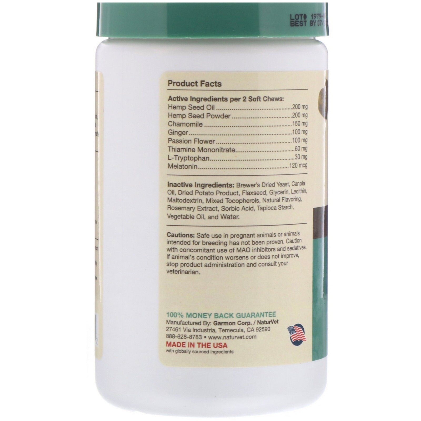 Wheat Free Quality Products For Over 20 Years Melatonin Ginger Quality Seal - NASC Hemp Health Benefits: Mood Activity Behavior Immune Memory Allergies Discomfort Calming Aid helps reduce stress and tension. Great for storms, fireworks, travel, and grooming. Veterinarian formulated Calming Aid with Chamomile, Thiamine, L-Tryptophan, Melatonin, and Hemp Seed. To complete this synergistic blend is Ginger to help support sensitive stomachs which is especially helpful while traveling.Sugg. UseFor use in dogs over the age of 12 weeks. Give recommended amount 30 minutes prior to stressful situation. Do not exceed double the above amount in a 12-hour period. Direction For Use Weight Amount Up to 26 lbs. 1 soft chew 27 to 50 lbs. 2 soft chews 51 to 99 lbs. 3 soft chews 100 lbs. and over 4 soft chewsOther IngredientsBrewer's dried yeast, canola oil, dried potato product, flaxseed, glycerin, lecithin, maltodextrin, mixed tocopherols, natural flavoring, rosemary extract, sorbic...