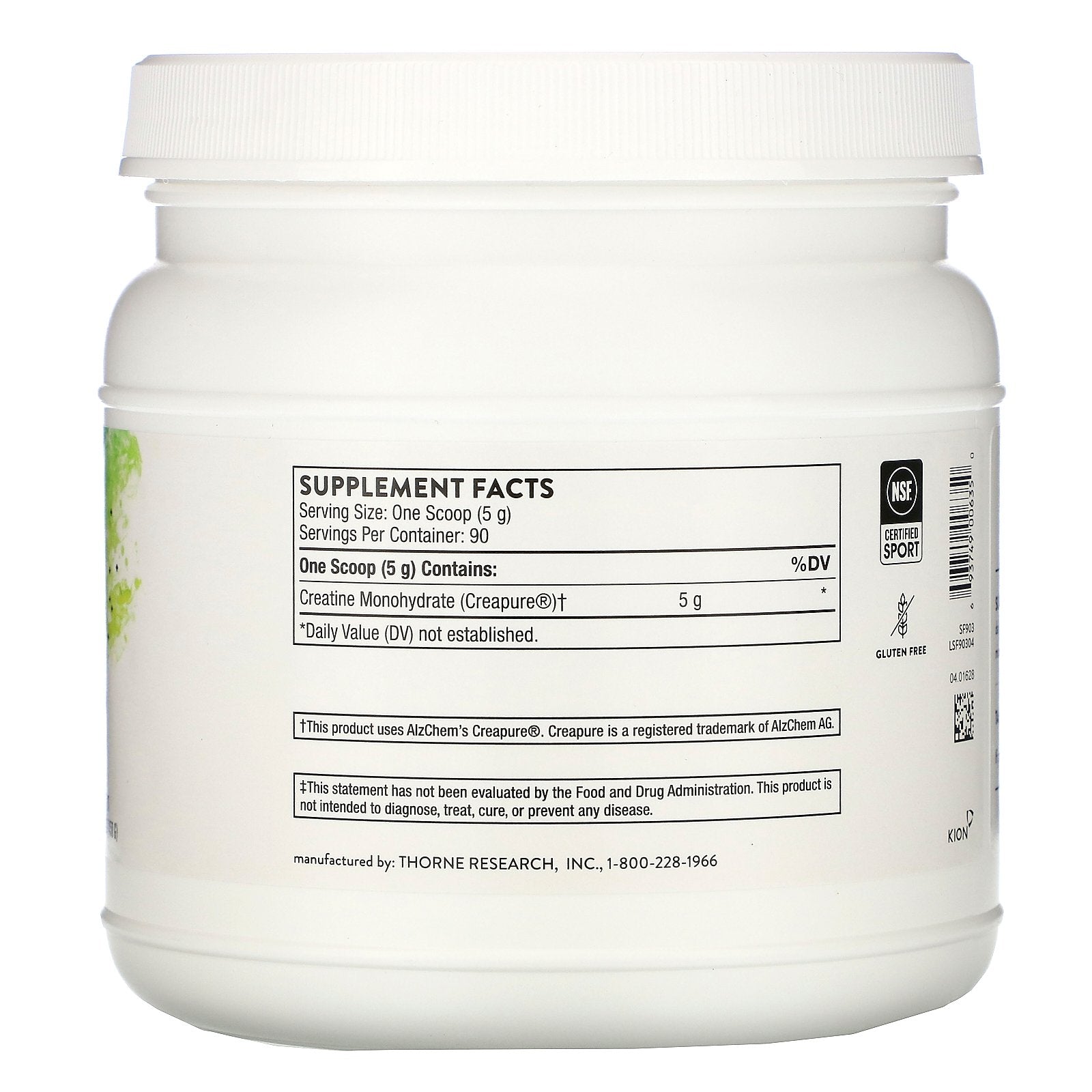 Dietary Supplement Gluten Free Sports Performance Supports energy production and helps maintain and promote lean body mass, muscle endurance, power. Creatine is an amino acid that supports increases in work capacity and muscle power output. It also promotes lean body mass and supports cognitive function. Thorne Creatine mixes well with liquids. NSF Certified for Sport. Thorne's Creatine is NSF Certified for Sport®. It plays an important role in the body's production of cellular energy because it helps make ATP, a molecule needed by all cells. Strenuous regular exercise or when muscle damage occurs increases the physiological need for creatine. Creatine supplementation supports increased work capacity and the power output of muscle while also promoting physical endurance and gain of lean body mass. For athletes, creatine helps the body more efficiently create energy to engage in exercise. Because creatine helps maintain hydration within the cells, it can mean a person might weigh more when stepping on the scale because the body is holding on to water within the muscles. Outside of the athlete population, creatine has also been shown to lessen muscle breakdown and to support cognitive function in aging populations. Thorne offers an easy-to-mix, highly-researched form of creatine – Creapure. Creatine, an amino acid naturally produced in the body from other amino acids, is also found in foods such as meats, eggs, and fish. The form of creatine offered by Thorne is Creapure, a micronized form of creatine monohydrate that is colorless, odorless, and offers enhanced solubility. Because an athlete needs to know that his or her supplements are trustworthy and compliant, every batch of an NSF Certified for Sport product is tested for compliance with label claims and to ensure the absence of more than 200 substances banned by many major athletic organizations, including stimulants, narcotics, steroids, diuretics, beta-2 agents, and masking agents.