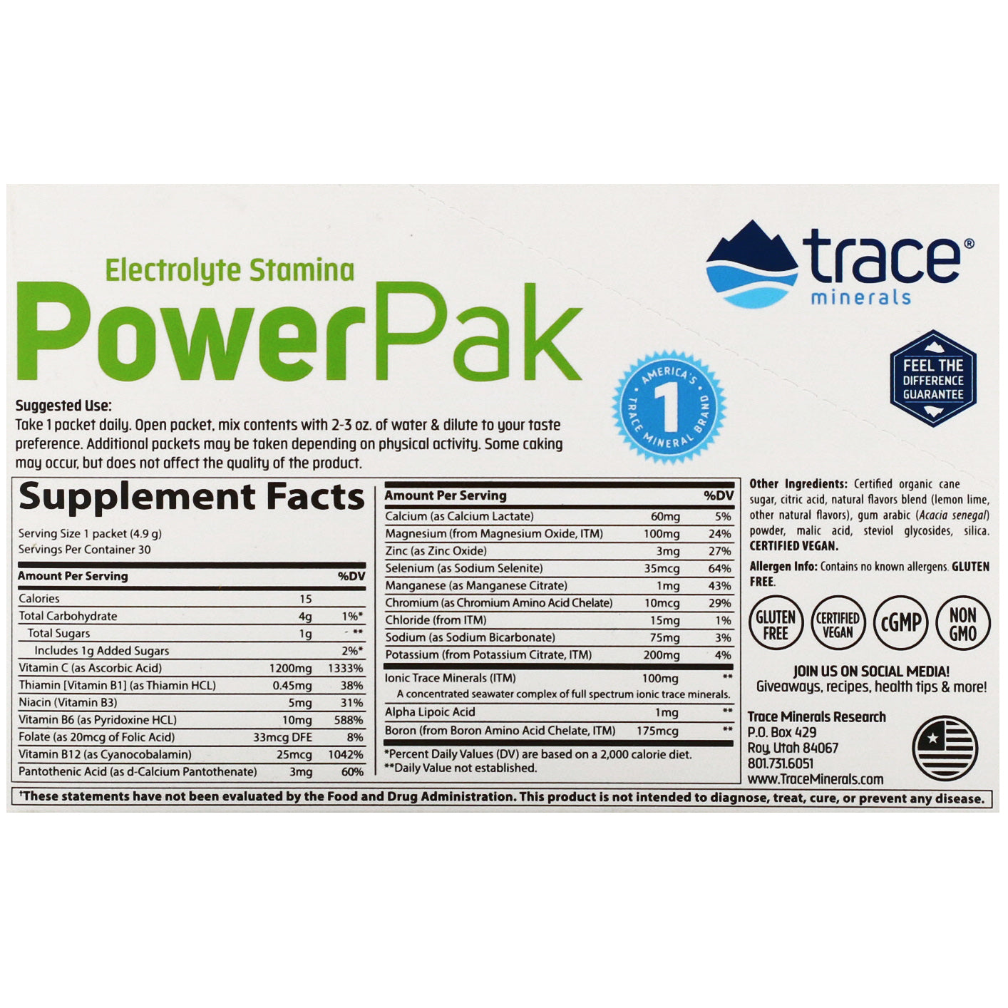 1,200 mg Vitamin C + Vitamins/Minerals Energy - Immunity - Hydration Effervescent Dietary Supplement America's #1 Trace Mineral Brand Gluten Free Certified Vegan cGMP Non GMO When should I take a PowerPak? Before, during, and after your workout to help maintain healthy hydration levels and avoid muscle cramps After a hot day in the sun Every day to maintain energy, vitality, and a healthy immune system To avoid occasional sluggishness & fatigue Why is PowerPak better? Better formula: only 1 g sugar, and 200 mg more vitamin C than the leading brand No caffeine, artificial flavors, or artificial stimulants Essential electrolytes: sodium, potassium, calcium, magnesium, and many more from Ionic Trace Minerals.