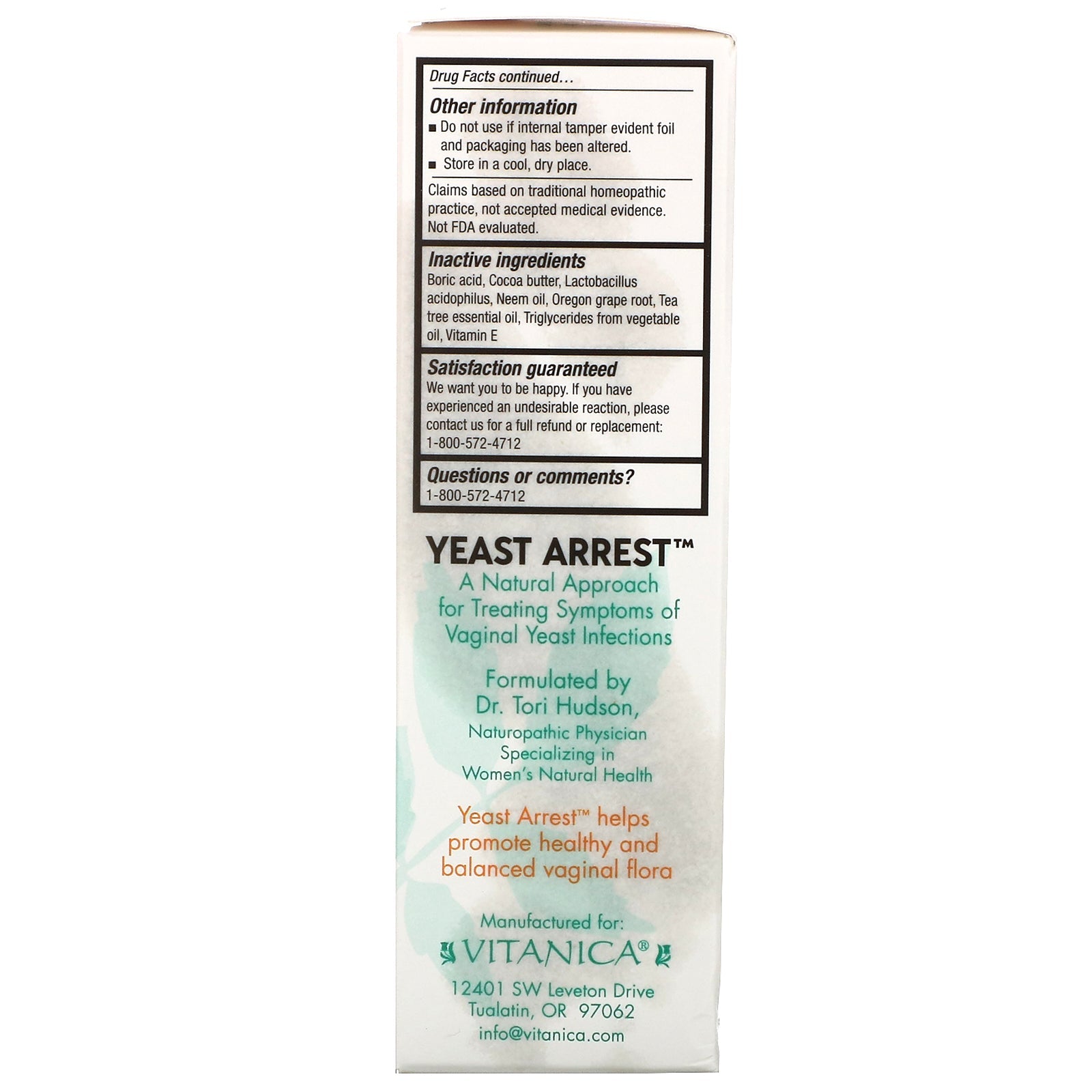 Homeopathic Formula A Natural Approach for Treating Symptoms of Vaginal Yeast Infections Helps Relieve Burning, Itching and Discharge Formulated for Women by a Woman for you Yeast Arrest™ Helps Promote Healthy and Balanced Vaginal Flora Consider these healthy suggestions: Avoid sugar, fruits, simple carbohydrates, baker's yeast and alcohol. Eat plain lactobacillus acidophilus yogurt and fresh garlic. Reduce stressors. Enjoy a diet of fresh vegetables and whole grains. Utilize exercise, fresh air and plenty of rest. Formulated by Dr. Tori Hudson - Naturopathic Physician Specializing in Women's Natural Health Uses: For the relief of external and internal irritation, burning, itching and discharge associated with a vaginal yeast infection.