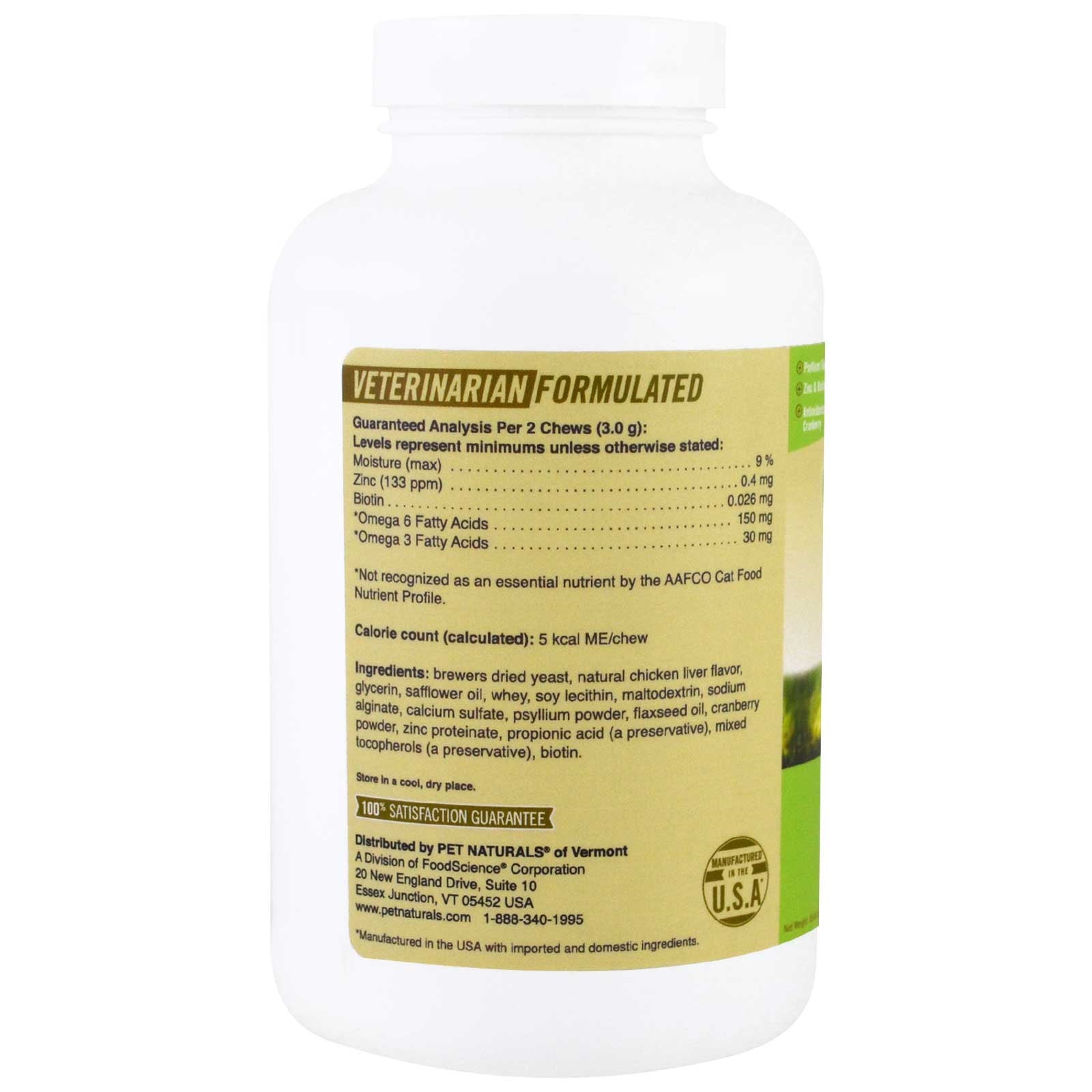 Psyllium Fiber Zinc & Biotin Antioxidant From Cranberry For Cats of All Sizes With Omegas 3+6 Supports Health Skin and Coat No Wheat No Corn No Artificial Ingredients** Quality Seal NASC - National Animal Supplement Council Veterinarian Formulated Manufacture in the U.S.A* Why It Works Hairball is a daily chew to support healthy skin and coat and GI and UT health. Formulated without herbals and mineral oil which dehydrate and cause skin and coat dysfunction. Hairball is an easy-to-deliver soft chew your cat will love. **No artificial colors, dyes or harmful preservatives *Manufactured in the USA with imported and domestic ingredients.Sugg. UseFeeding Directions: For All Cats General skin coat and coat health: Give 2 chews daily. Extra support: Give 4 chews, twice daily, for 2-4 days.Other IngredientsBrewers dried yeast, natural chicken liver flavor, glycerin, safflower oil, whey, soy lecithin, maltodextrin, sodium alginate, calcium sulfate, psyllium powder, flaxseed oil, cranberry powder,...