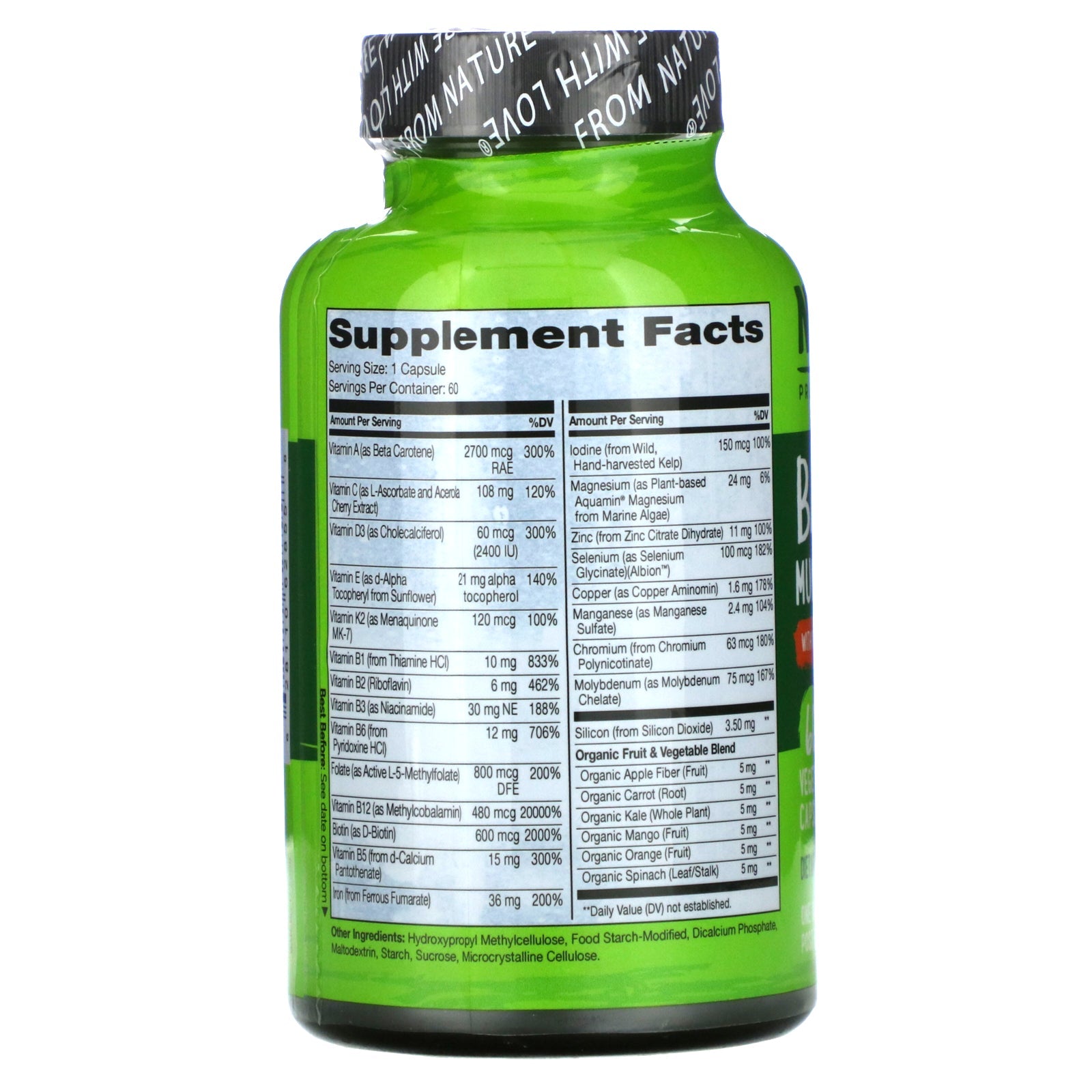 Serving Size: 1 Capsule Serving Per Container: 60 Amount Per Serving %Daily Value Vitamin A (as Beta Carotene) 2700 mcg RAE 300% Vitamin C (as L-Ascorbate and Acerola Cherry Extract) 108 mg 120% Vitamin D3 (as Cholecalciferol) 60 mcg (2400 IU) 300% Vitamin E (as d-Alpha Tocopheryl from Sunflower) 21 mg alpha tocopherol 140% Vitamin K2 (as Menaquinone MK-7) 120 mcg 100% Vitamin B1 (from Thiamine HCl) 10 mg 833% Vitamin B2 (Riboflavin) 6 mg 462% Vitamin B3 (as Niacinamide) 30 mg NE 188% Vitamin B6 (from Pyridoxine HCl) 12 mg 706% Folate (as Active L-5-Methylfolate) 800 mcg DFE 200% Vitamin B12 (as Methylcobalamin) 480 mcg 20000% Biotin (as D-Biotin) 600 mcg 2000% Vitamin B5 (from d-Calcium Pantothenate) 15 mg 300% Iron (from Ferrous Fumarate) 36 mg 200% Iodine (from Wild, Hand-harvested Kelp) 150 mcg 100% Magnesium (as Plant-based Aquamin® Magnesium from Marine Algae) 24 mg 6% Zinc ( from Zinc Citrate Dihydrate) 11 mg 100% Selenium (as Selenium Glycinate) (Albion™) 100 mcg 182% Copper (as Copper Aminomin) 1.6 mg 178% Manganese (as Manganese Sulfate) 2.4 mg 104% Chromium (from Chromium Polynicotinate) 63 mcg 180% Molybdenum (as Molybdenum Chelate) 75 mcg 167% Silicon (from Silicon Dioxide) 3.50 mg ** Organic Fruit & Vegetable Blend Organic Apple Fiber (Fruit) 5 mg ** Organic Carrot (Root) 5 mg ** Organic Kale (Whole Plant) 5 mg ** Organic Mango (Fruit) 5 mg ** Organic Orange (Fruit) 5 mg ** Organic Spinach (Leaf/Stalk) 5 mg ** **Daily Value (DV) not established.Disclaimer