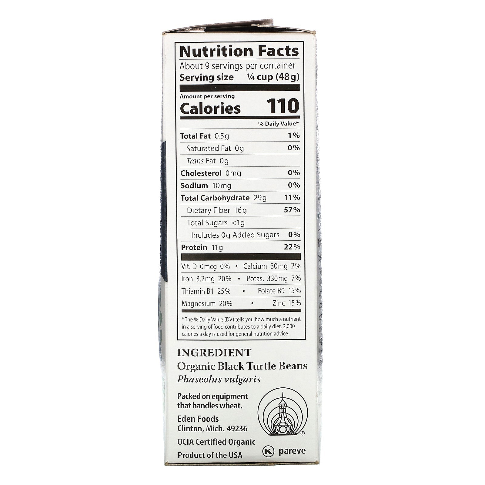 Serving Size: 1/4 cup (48 g) Serving Per Container: About 9 Amount Per Serving %Daily Value* Calories 110 Total Fat 0.5 g 1% Saturated Fat 0 g 0% Trans Fat 0 g Cholesterol 0 mg 0% Sodium 10 mg 0% Total Carbohydrate 29 g 11% Dietary Fiber 16 g 57% Total Sugars <1 g Includes 0 g Added Sugars 0% Protein 11 g 22% Vitamin D 0 mcg 0% Calcium 30 mg 2% Iron 3.2 mg 20% Potas. 330 mg 7% Thiamin B1 25% Folate B9 15% Magnesium 20% Zinc 15% *The % Daily Value (DV) tells you how much a nutrient in a serving of food contributes to a daily diet. 2,000 calories a day is used for general nutrition advice.Disclaimer