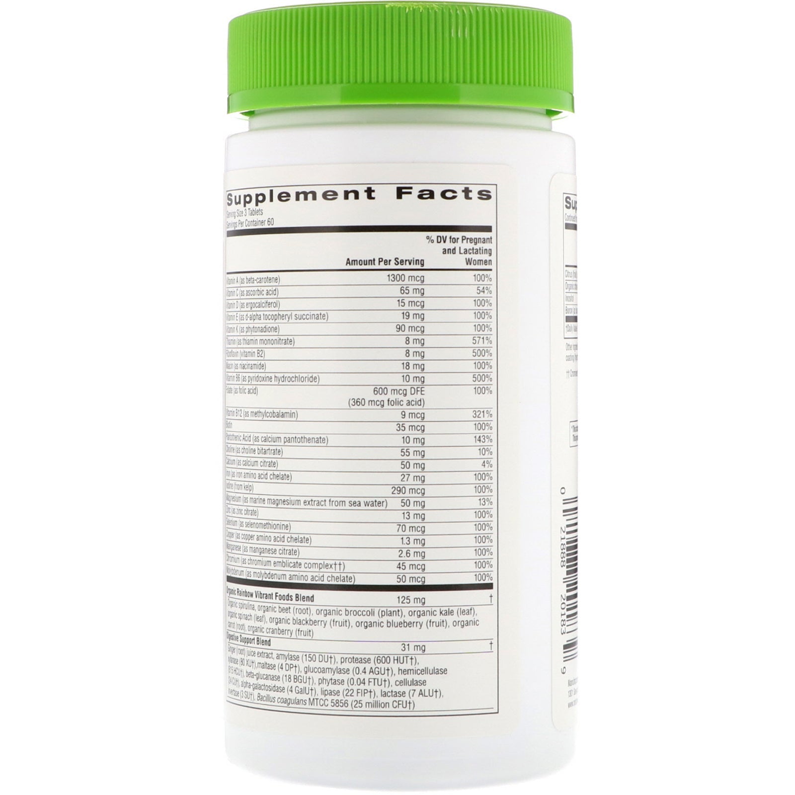 Serving Size: 3 Tablets Servings Per Container: 60 Amount Per Serving % DV Vitamin A (as Beta-carotene) 1300 mcg 100% Vitamin C (as Ascorbic Acid) 65 mg 54% Vitamin D (as ergocalciferol) 15 mcg 100% Vitamin E (as d-alpha Tocopheryl Succinate) 19 mg 100% Vitamin K (as Phytonadione) 90 mcg 100% Thiamin (as Thiamin Mononitrate) 8 mg 571% Riboflavin (Vitamin B-2) 8 mg 500% Niacin (as Niacinamide) 18 mg 100% Vitamin B-6 (as Pyridoxine hydrochloride) 10 mg 500% Folic Acid (as folic acid) 600 mcg DFE (360 mcg folic acid) 100% Vitamin B-12 (as methylcobalamin) 9 mcg 321% Biotin 35 mcg 100% Pantothenic (as Calcium Pantothenate) 10 mg 143% Choline (as Choline Bitartrate) 55 mg 10% Calcium (as Calcium, Citrate) 50 mg 4% Iron (as Iron Amino Acid Chelate) 27 mg 100% Iodine (from Kelp) 290 mcg 100% Magnesium (as Marine Magnesium Extract from Sea Water) 50 mg 13% Zinc (as Zinc Citrate) 13 mg 100% Selenium (as Selenomethionine) 70 mcg 100% Copper (as Copper Amino Acid Chelate) 1.3 mg 100% Manganese (as Manganese Citrate) 2.6 mg 100% Chromium (as Chromium Emblicate Complex††) 45 mcg 100% Molybdenum (as Molybdenum Amino Acid Chelate) 50 mcg 100% Organic Rainbow Vibrant Foods Blend 125 mg † Organic Spirulina, Organic beet (root), Organic Broccoli (plant), Organic Kale (leaf), Organic Spinach (leaf), Organic Blackberry (fruit), Organic blueberry (fruit), Organic Carrot (root), Organic Cranberry (fruit) Digestive Support Blend 31 mg † Ginger (root) Juice Extract, amylase (150 DU†), Protease (600 Hut†), Xylanase (80 XU†), Maltase (4 DP†), Glucoamylase (0.4 AGU†), Hemicellulase (615 HCU†), Beta-Glucanase (18 BGU†), Phytase (0.04 FTU†), Cellulase (24 CU†), Alpha-Galactosidase (4 GaIU†), lipase (22 FIP†), Lactase (7 Alu†), Invertase (3 SU†), Bacillus Coagulants MTCC 5856 (25 million CFU†) †Daily Value (DV) not established.Disclaimer